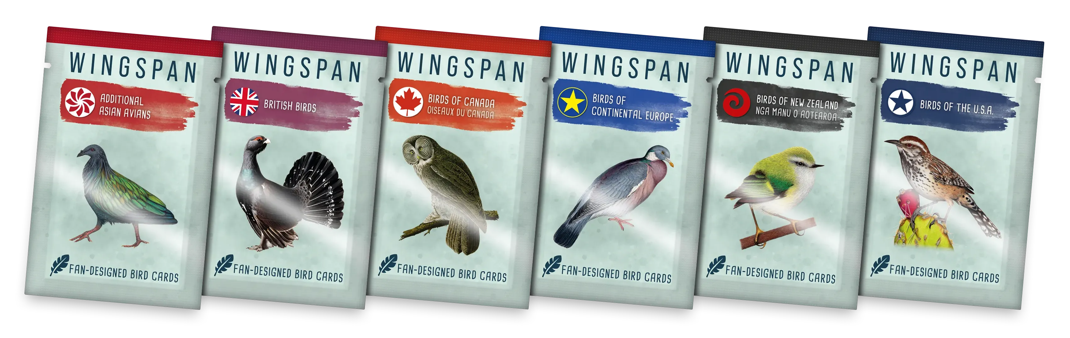 In cooperation with Elizabeth Hargrave, fan creation coordinator Travis Willse, and a few selected designers, we have officially printed some fan-designed bird promo packs. This is a box of ALL 6 promo packs, each containing 25 completely new birds in continents already covered by Wingspan, for a total of 150 new cards. The art is consistent with the general style of all other birds in the game.